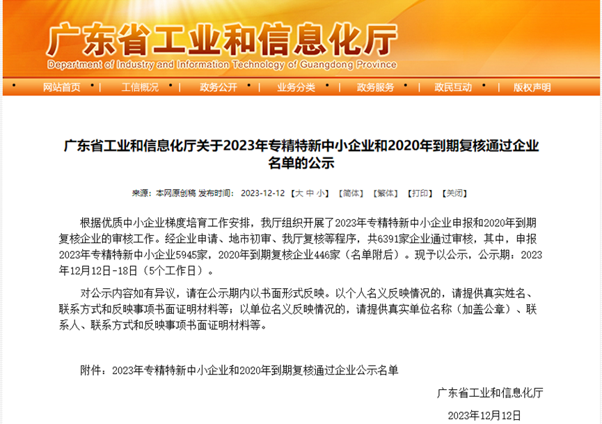 近日,广东省工业和信息化厅发布了“关于2023年专精特新中小企业和2020年到期复核通过企业名单的公示”,广东联鲲集团有限公司成功认定为2023年专精特新中小企业。这是继广州市联鲲生物科技有限公司2022年成功认定该资质荣誉后,联鲲集团第2家公司获此殊荣。标志着省级政府对联鲲经营实力、创新能力、专业化水平以及精细化程度等综合实力的高度认可。