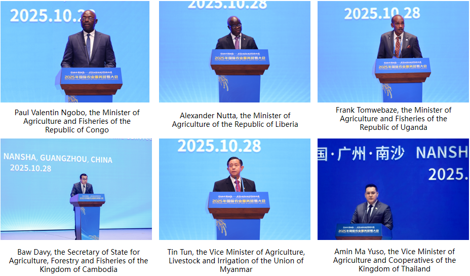 Zhang Zhili, the Party member of the Ministry of Agriculture and Rural Affairs, Vice Minister and Chen Liangxian, the Party member of Guangdong Provincial Government delivered speeches separately. Paul Valentin Ngobo, the Minister of Agriculture and Fisheries of the Republic of Congo, Alexander Nutta, the Minister of Agriculture of the Republic of Liberia, Frank Tomwebaze, the Minister of Agriculture and Fisheries of the Republic of Uganda, Baw Davy, the Secretary of State for Agriculture, Forestry and Fisheries of the Kingdom of Cambodia, Tin Tun, the Vice Minister of Agriculture, Livestock and Irrigation of the Union of Myanmar, Amin Ma Yuso, the Vice Minister of Agriculture and Cooperatives of the Kingdom of Thailand, Zhao Chunjiang, the Academician of the Chinese Academy of Engineering, Wang Bo, Deputy Director-General of the Department of Trade in Services and Commercial Services of the Ministry of Commerce, and Liu Wei, the Secretary of the Party Committee of Nansha District and Member of the Standing Committee of the CPC Guangzhou Municipal Committee, spoke at the forum.